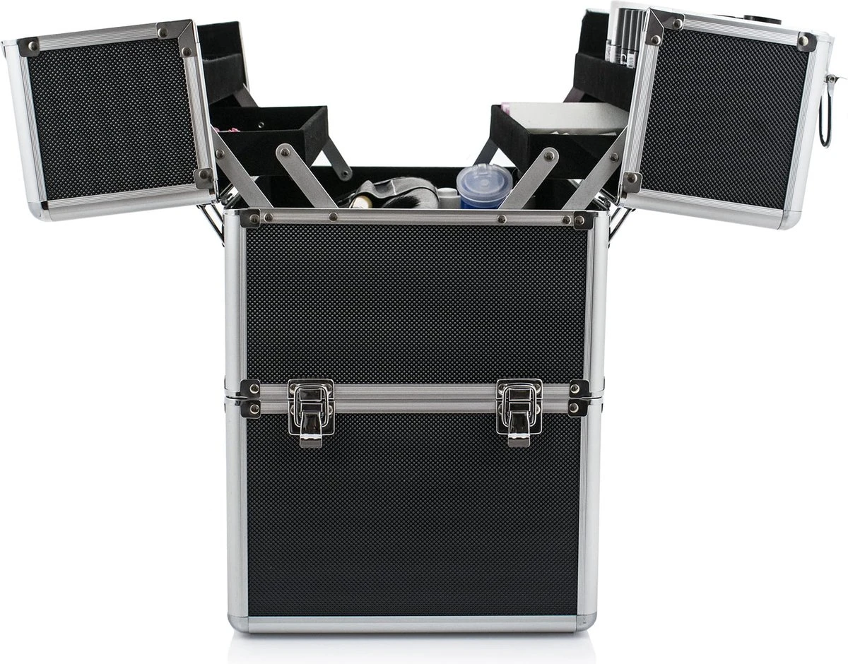 In de stevige, opvouwbare en optimaal bemeten make up koffer XL Zwart kun je eenvoudig een full-size UV- en LED-lamp plaatsen. De make-up koffer Robuust Zwart XXL gaat aan beide zijden open en heeft 2 verschuifbare planken voor kleine gebruiksvoorwerpen, zoals hybride nagellakken, penselen, kleine en grote cosmetica. Door het lage gewicht perfect voor veldwerk. Het is een stijlvolle make up koffer voor het presenteren van producten tijdens officiële bijeenkomsten, bijvoorbeeld zakelijke bijeenkomsten.